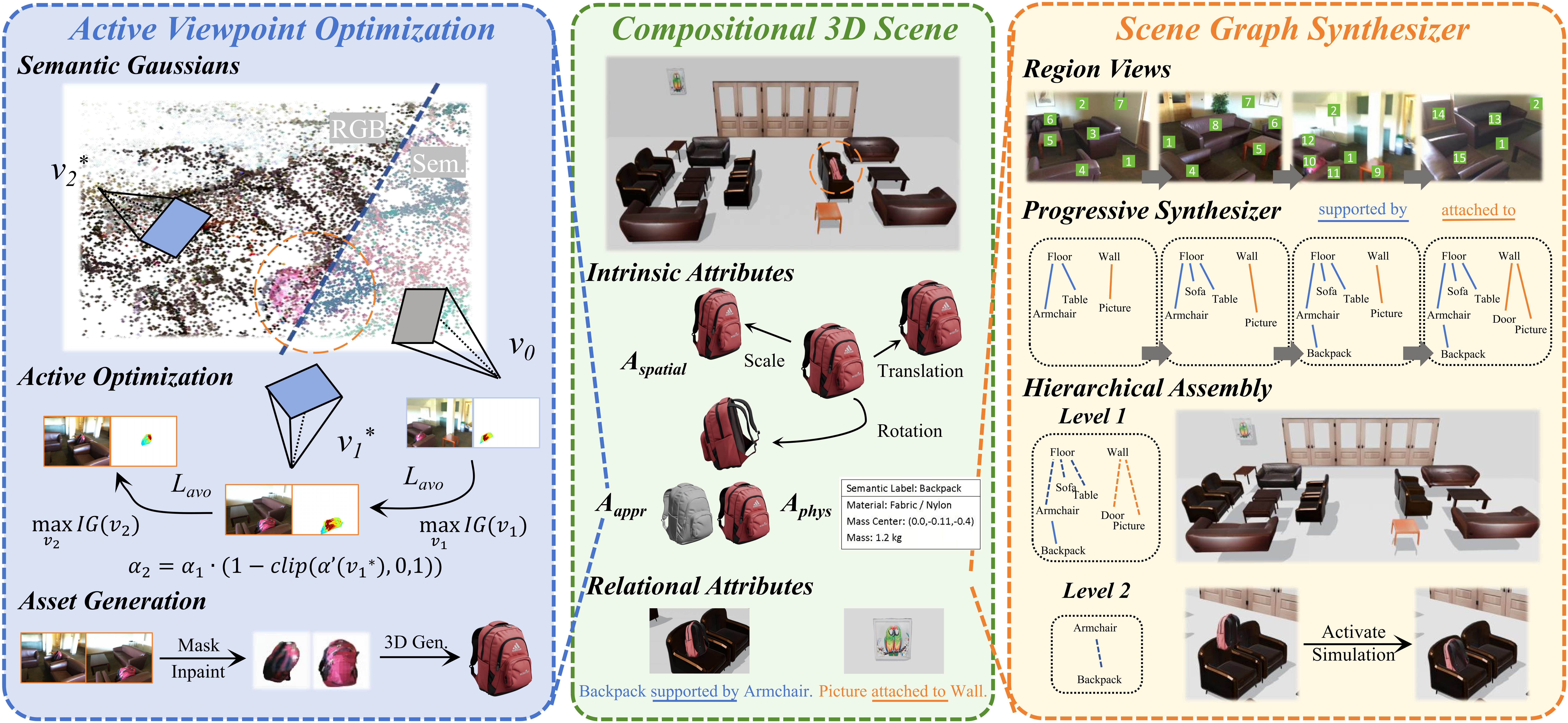 The overall framework of our approach SimRecon. We propose a “Perception-Generation-Simulation” pipeline with object-centric scene representations towards compositional 3D scene reconstruction from cluttered video input. In this figure, we provide illustrative visualizations using the backpack as the example to introduce our two core modules: Active Viewpoint Optimization (AVO) and Scene Graph Synthesizer (SGS). There, we visualize a semantic-level graph for clarity, while our framework operates at the instance-level.